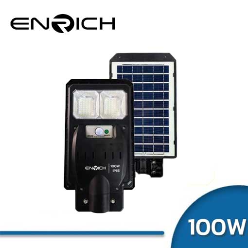 โคมไฟถนนโซล่าเซลล์ LED 100W ENRICH รุ่น SUNLIGHT เป็นผลิตภัณฑ์ โซล่าเซลล์แบบ ALL IN ONE โคมไฟถนนโซล่าเซลล์ LED รุ่นนี้ ได้มีการพัฒนาเทคโนโลยีการส่องสว่างให้มีประสิทธิภาพมากขึ้น โดยเปลี่ยนการใช้พลังงานจากแสงอาทิตย์โดยตรง มาประจุพลังงานไว้ที่แบตเตอรี่แทน เพื่อช่วยประหยัดค่าไฟ