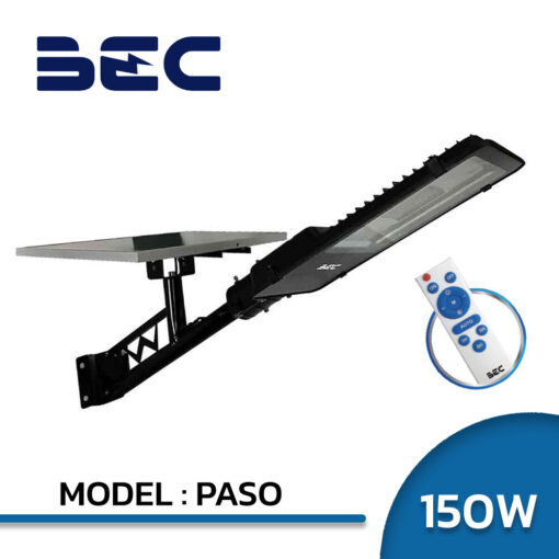 โคมไฟถนนโซล่าเซลล์ 150W BEC รุ่น PASO เป็น โคมไฟถนน LED โซล่าเซลล์ ที่จะมีแผงโซล่าเซลล์ แยกกับตัวโคมไฟถนน เทคโนโลยใหม่แห่งการประหยัดพลังงาน โดยใช้พลังงานแสงอาทิตย์แทนพลังงานไฟฟ้า ตัวโคมไฟถนนโซล่าเซลล์ ผลิตมาจากอลูมิเนียม และ เหล็ก รับรองคุณภาพความแข็งแรง ทนทาน สามารถใช้งานกลางแจ้งได้ มาพร้อมกับระบบควบคุมการทำงานผ่านรีโมทคอนโทรล ติดตั้งใช้งานง่าย ไม่ต้องเดินสายไฟ เหมาะสำหรับติดตั้งบริเวณทางเดิน ถนนหมู่บ้าน สวนสาธารณะ เป็นต้น