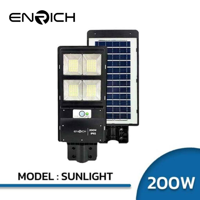โคมไฟถนนโซล่าเซลล์ LED 200W ENRICH รุ่น SUNLIGHT เป็นผลิตภัณฑ์ โซล่าเซลล์แบบ ALL IN ONE โคมไฟถนนโซล่าเซลล์ LED รุ่นนี้ ได้มีการพัฒนาเทคโนโลยีการส่องสว่างให้มีประสิทธิภาพมากขึ้น โดยเปลี่ยนการใช้พลังงานจากแสงอาทิตย์โดยตรง มาประจุพลังงานไว้ที่แบตเตอรี่แทน เพื่อช่วยประหยัดค่าไฟ