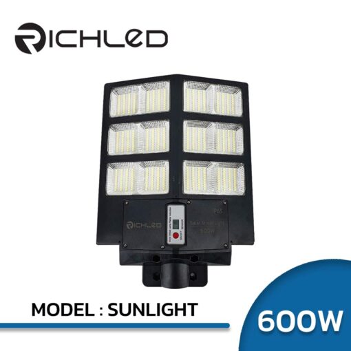 โคมไฟถนนโซล่าเซลล์ LED 600W RICHLED รุ่น SUNLIGHT เป็นผลิตภัณฑ์ โซล่าเซลล์แบบ ALL IN ONE โคมไฟถนนโซล่าเซลล์ LED รุ่นนี้ ได้มีการพัฒนาเทคโนโลยีการส่องสว่างให้มีประสิทธิภาพมากขึ้น โดยเปลี่ยนการใช้พลังงานจากแสงอาทิตย์โดยตรง มาประจุพลังงานไว้ที่แบตเตอรี่แทน เพื่อช่วยประหยัดค่าไฟ